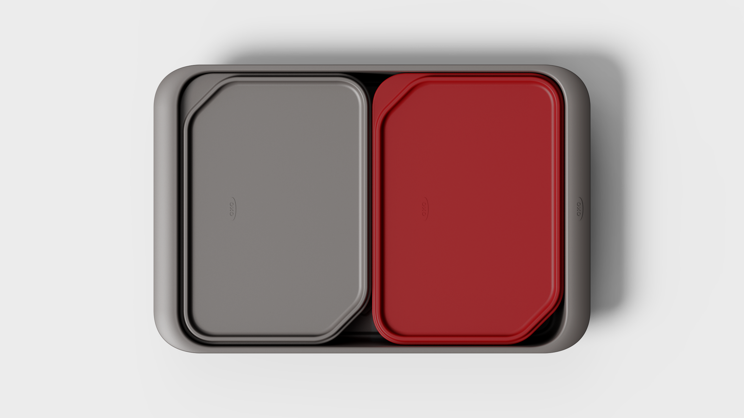 This set of containers and trays is designed for easy nesting, stacking, and organization. The large container can hold tools or large cuts of meat, and the lid serves as a cutting board. The smaller containers are color coded and come with lids and raised grooves for marinating. The angled corners allow for easy removal when nested inside the large tray.
