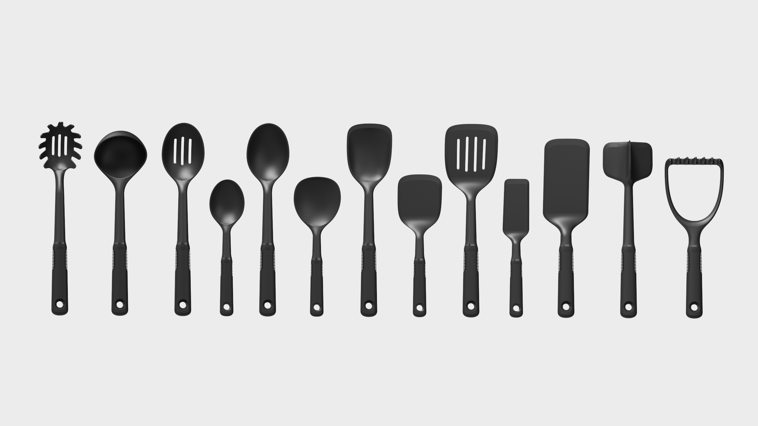 OXO needed to refresh its core Nylon Utensil line to make it cohesive with the evolved design language and improve the construction. This included the addition of a Potato Masher, Ground Meat Chopper, Griddle Turner, and Saute Spoon. We also developed a new set of mini utensils for smaller cooking tasks, including a Rice Scoop and Cut and Serve Turner. I designed the new set of utensils to feel cohesive with our new visual brand language while considering the functional needs of each individual product.