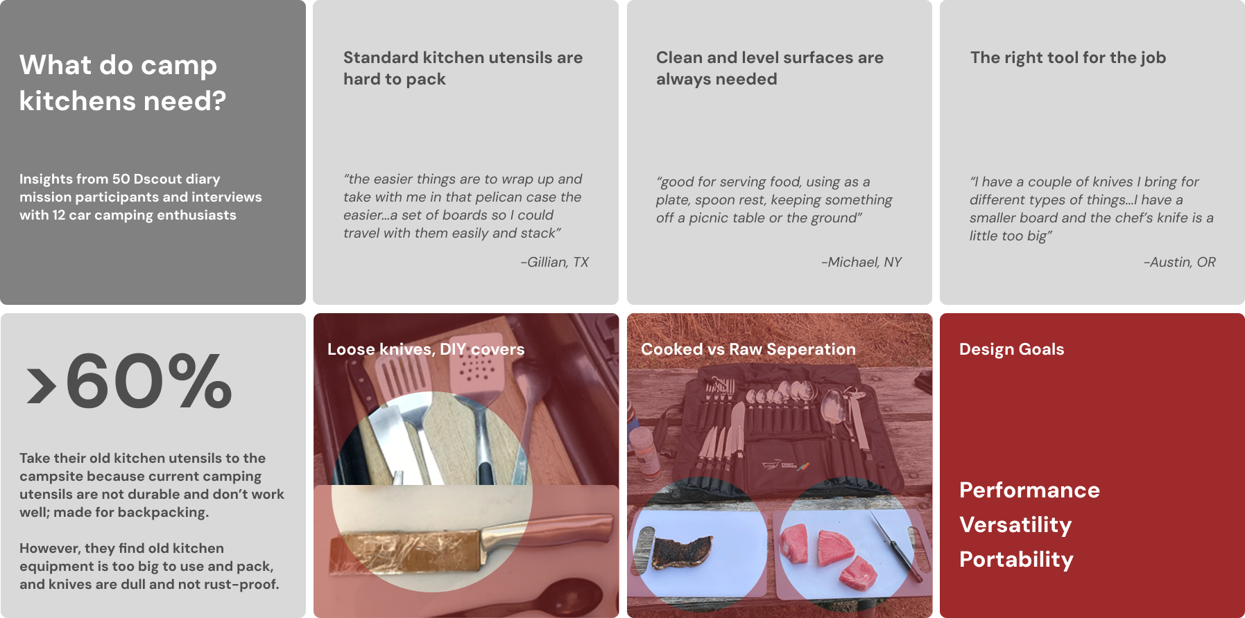 Originally developed as part of an exclusive partnership with REI. Car camping lets you explore the great outdoors without the packing limitations of backpacking - and every great trip needs great food. Our team identified product opportunities to improve the camp kitchen experience; my focus was on designing a cutting board set and knife.
